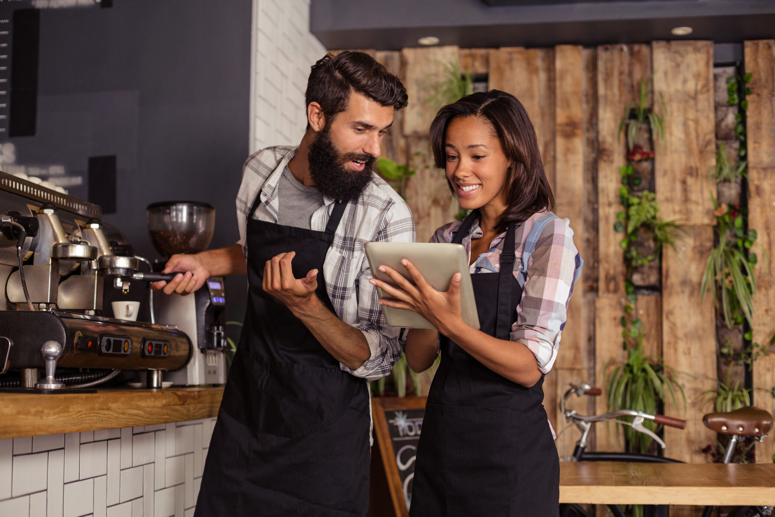 Waitress using a tablet computer and waiter with coffee machine